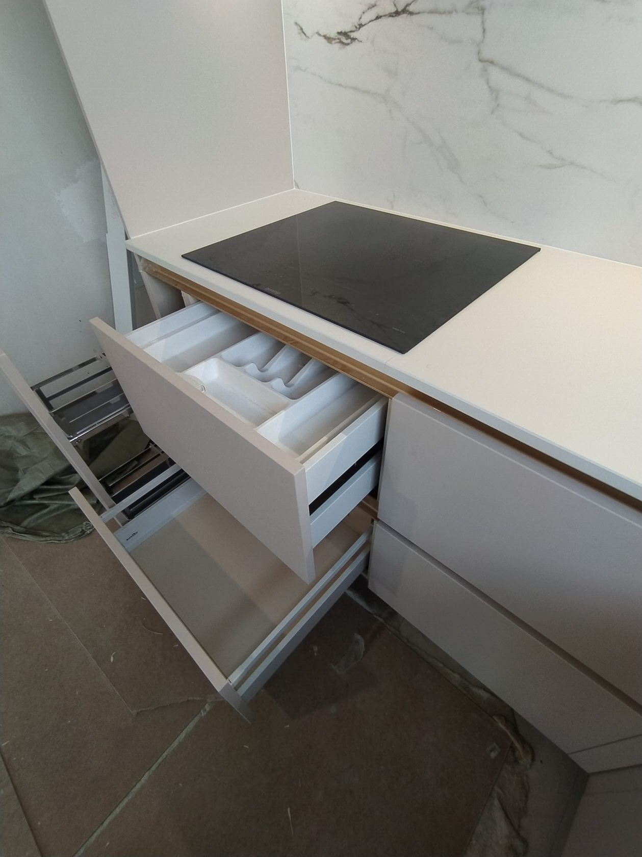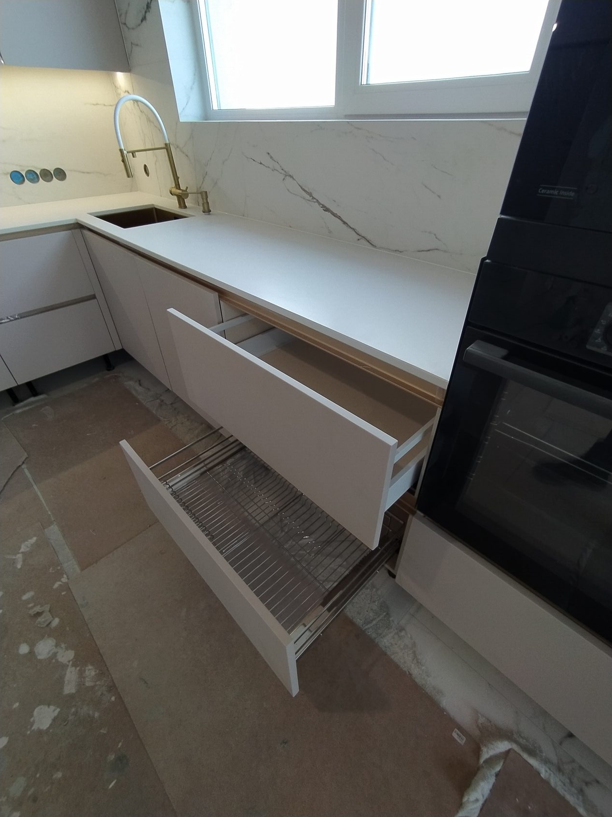 Компактная и очень функциональная г-образная кухня. Обилие выдвижных систем делает эту кухню очень удобной в эксплуатации. Отдельный удачный ход — это перенос классической верхней сушки для посуды в нижние ящики. А отсутствие верхних модулей на переднем плане делает кухню визуально облегчённой.