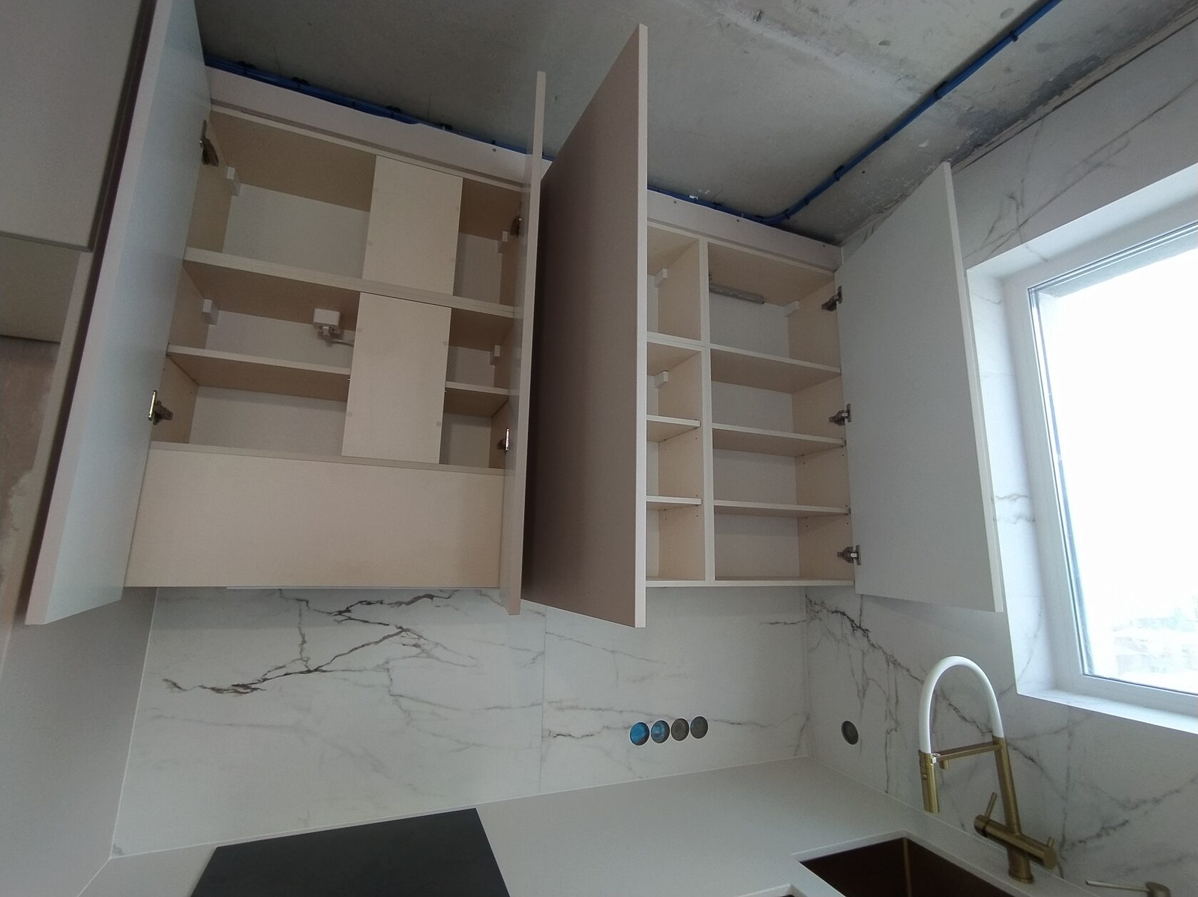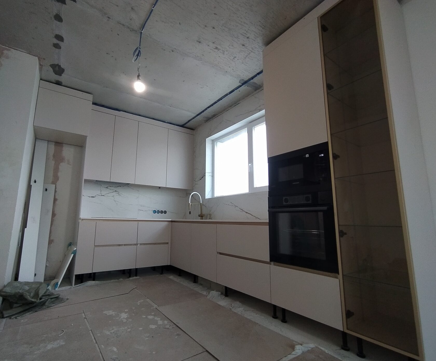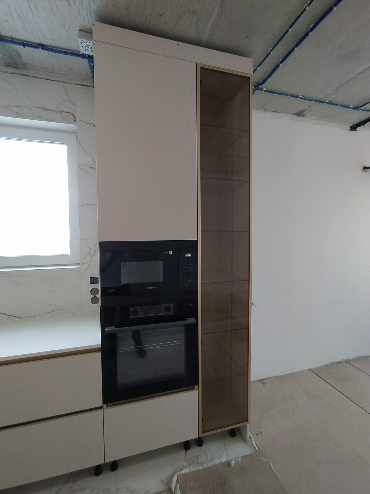 Кухня в монохроме, с прямыми фасадами и золотыми вставками. Стиль, который не устареет даже через 10−15 лет. Постельные тона не обязывают остальное помещение к продолжению цветовых решений. Использован современный тренд, который всё чаще делают люди, заказывающие мебель — витринный фасад. Он является логическим продолжением GOLA-профиля.