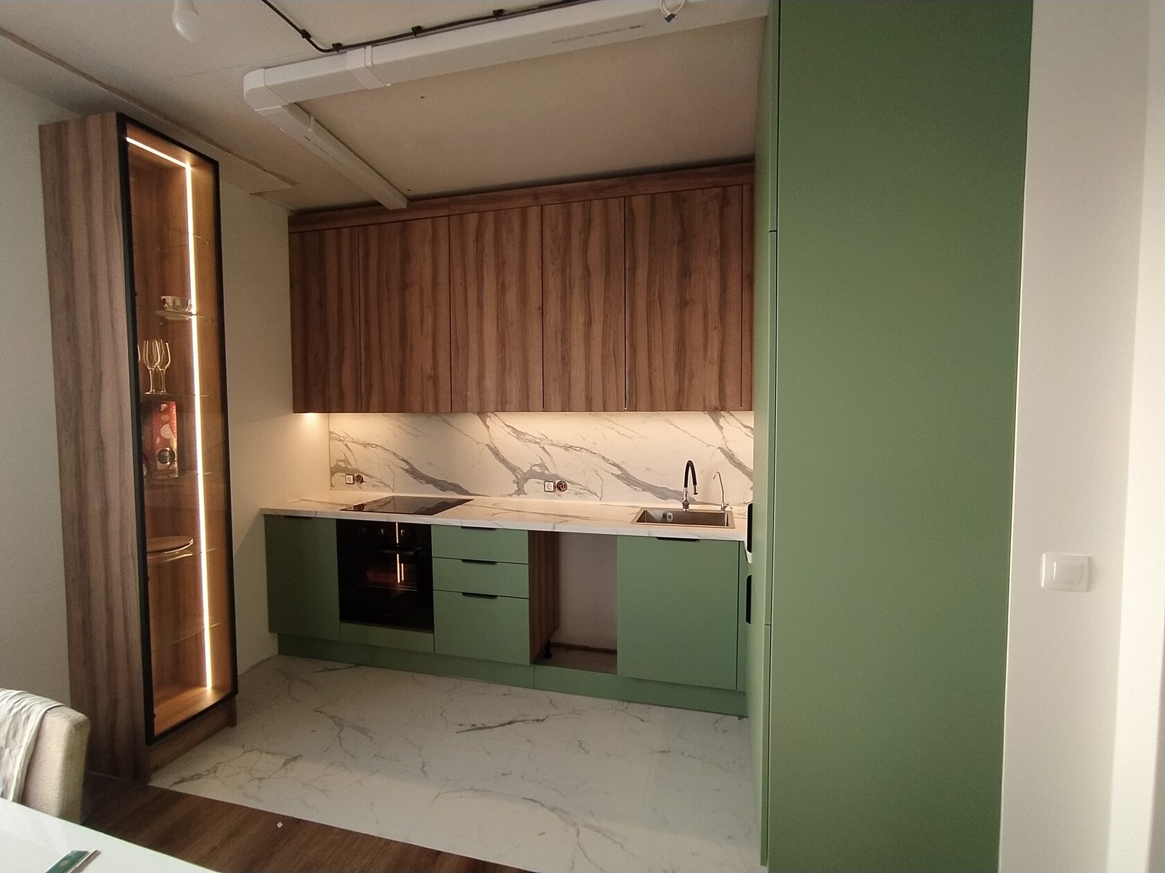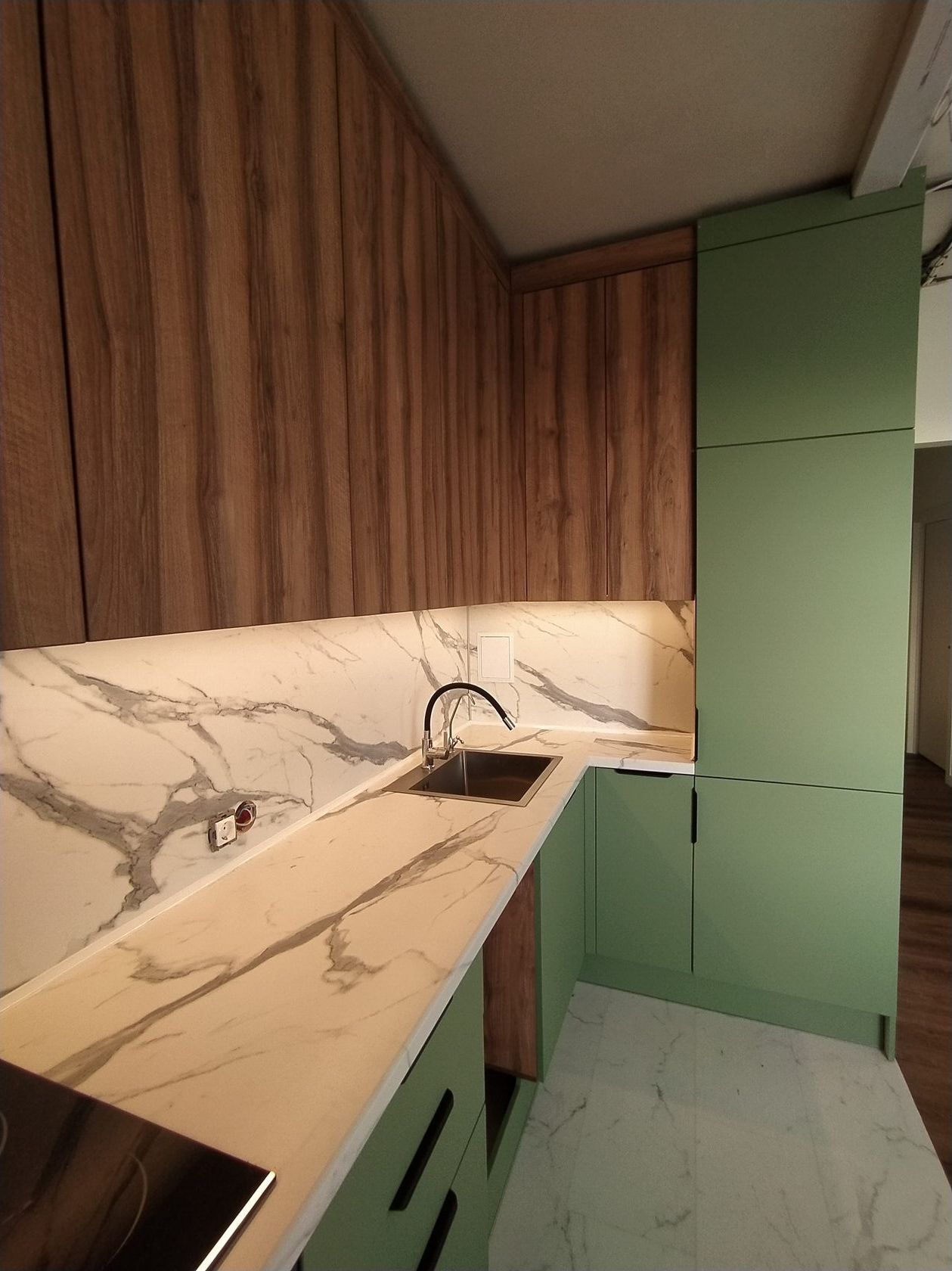 Кухня из благородных материалов. Фасады — крашенные массив и шпон, столешница — кварцевый агломерат. Небольшая, но есть всё необходимое. Не давит визуально, мягкие и тёплые цвета создают неповторимый уют.
