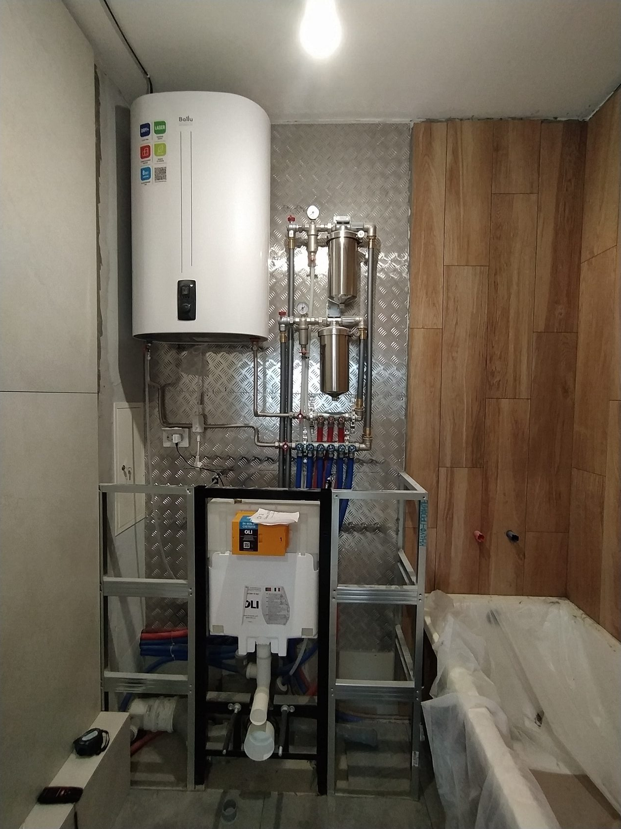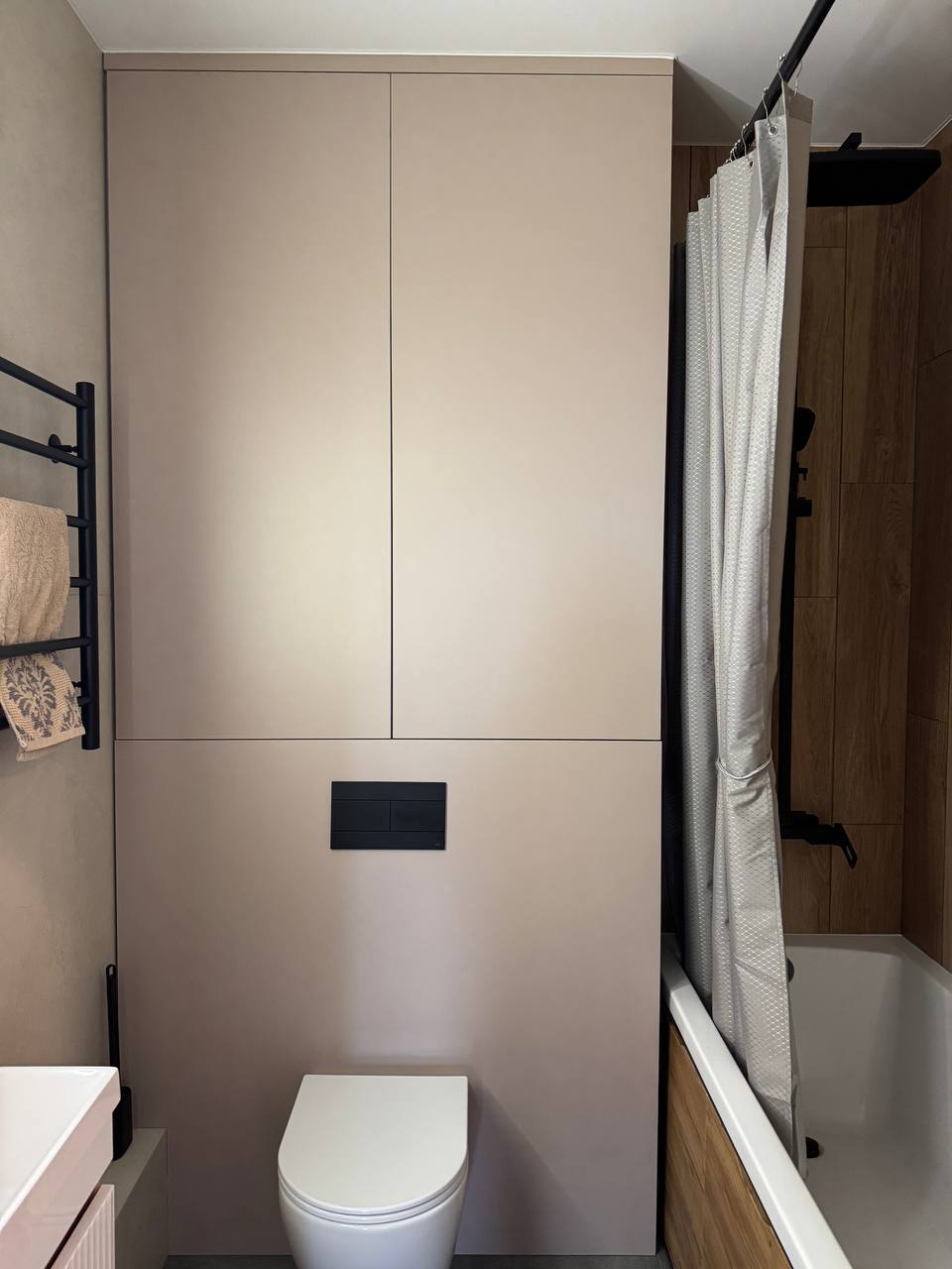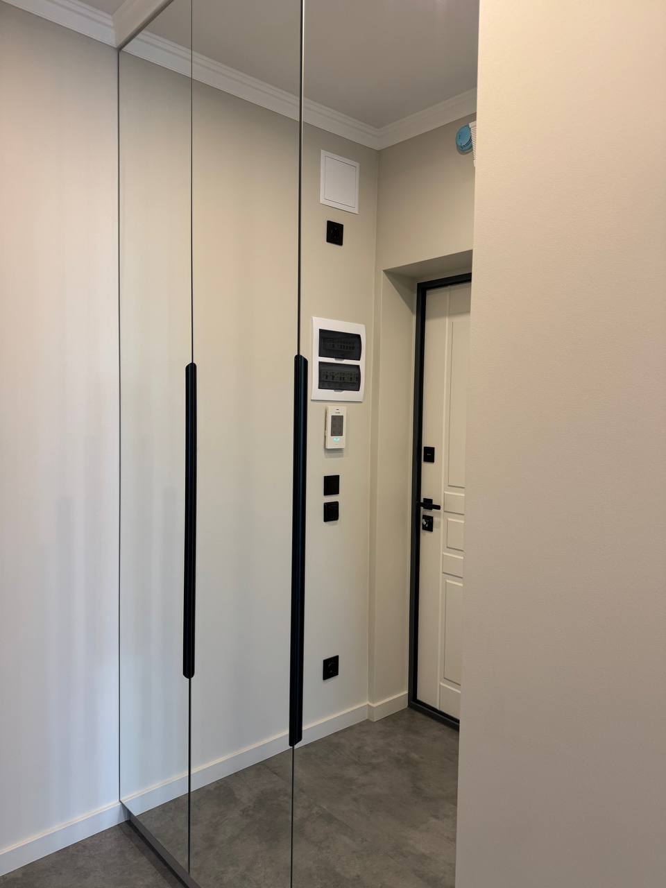 Все три элемента на одной стороне квартиры, идут друг за другом. Поэтому необходим был единый стиль, для единства всей проходной зоны. При таком решении не возникает визуального шума, но в то же время позволяет зонировать пространство.