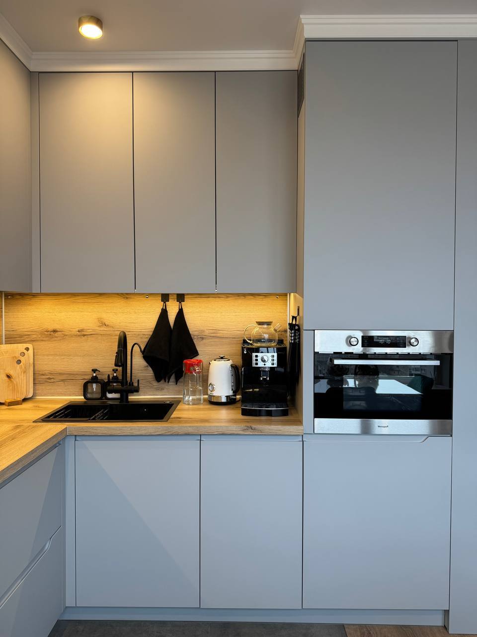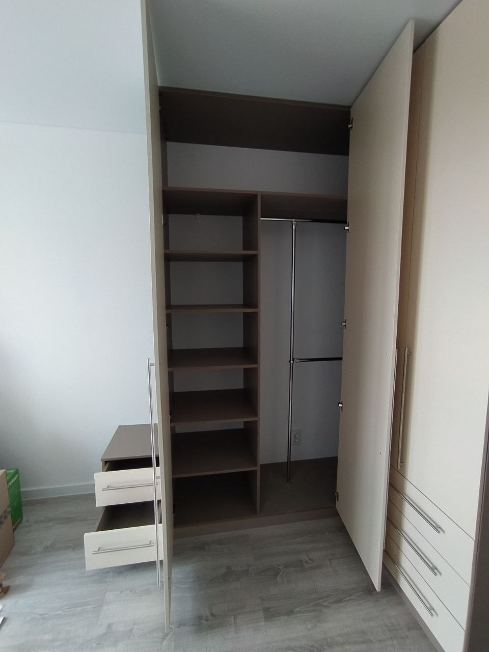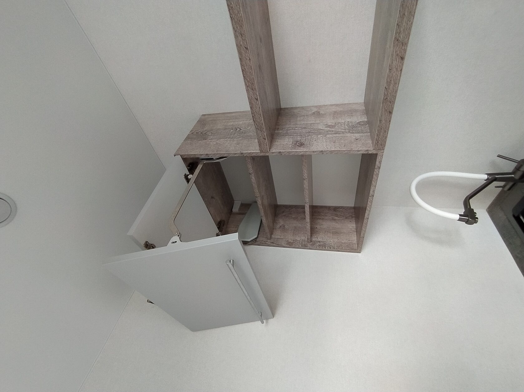 Квартиры с небольшой площадью требуют особого внимания к наполнению. Малые площади требуют от мебели максимального функционала. Кухня несмотря на маленькие размеры оснащена почти всеми элементами хранения: бутылочница, выкатная сушка, выкатные ящики. Шкаф в спальне способен вместить в себя и сезонные вещи, и домашние, и даже постельное бельё. Прихожая имеет внушительную вместимость, благодаря выкатным вешалкам.